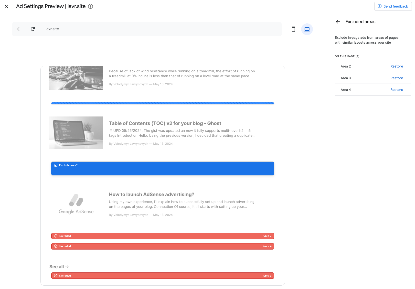 Preview how the auto-ads will appear on your site based on your settings. This helps visualize the impact before implementing the changes.