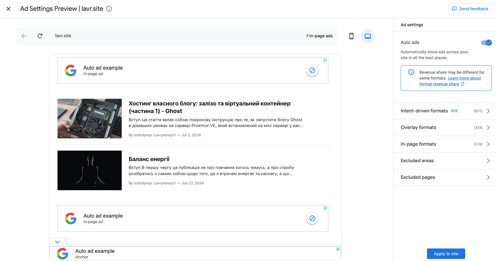 - Ad Formats Enabled: Display ads, in-article ads, in-feed ads