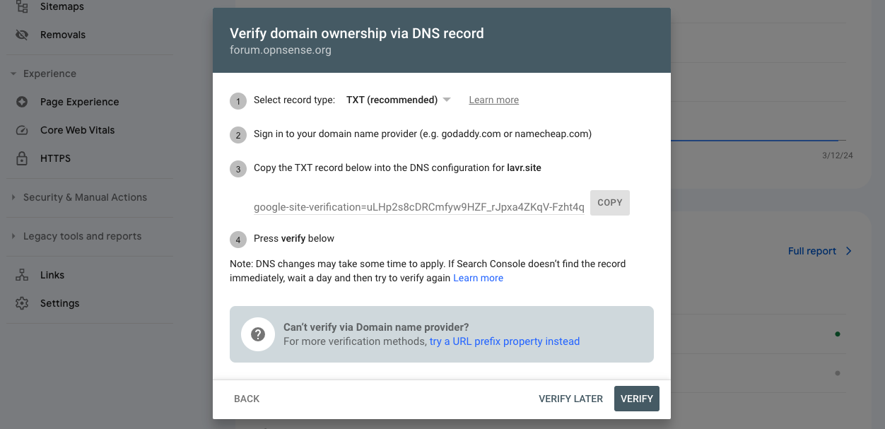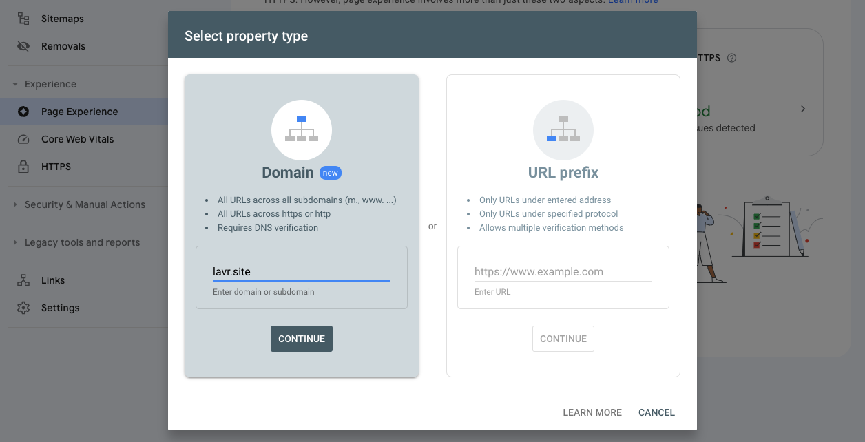 First, you'll need to add your site to the console. Enter the domain and proceed with verification.