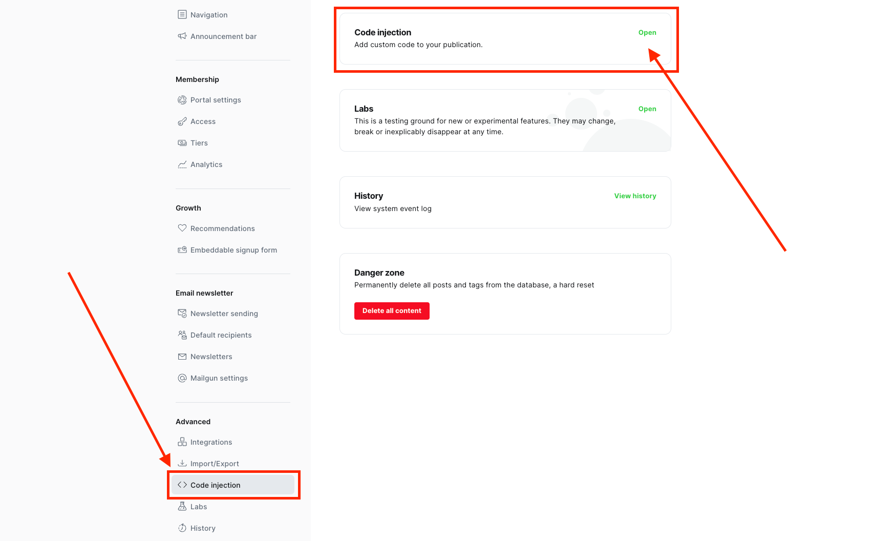 Коли все зібрано, то переходимо на сторінку налаштувань вашого блогу як адміністратор, а в меню зліва шукаємо Code Injection і нажимаємо на кнопку Open