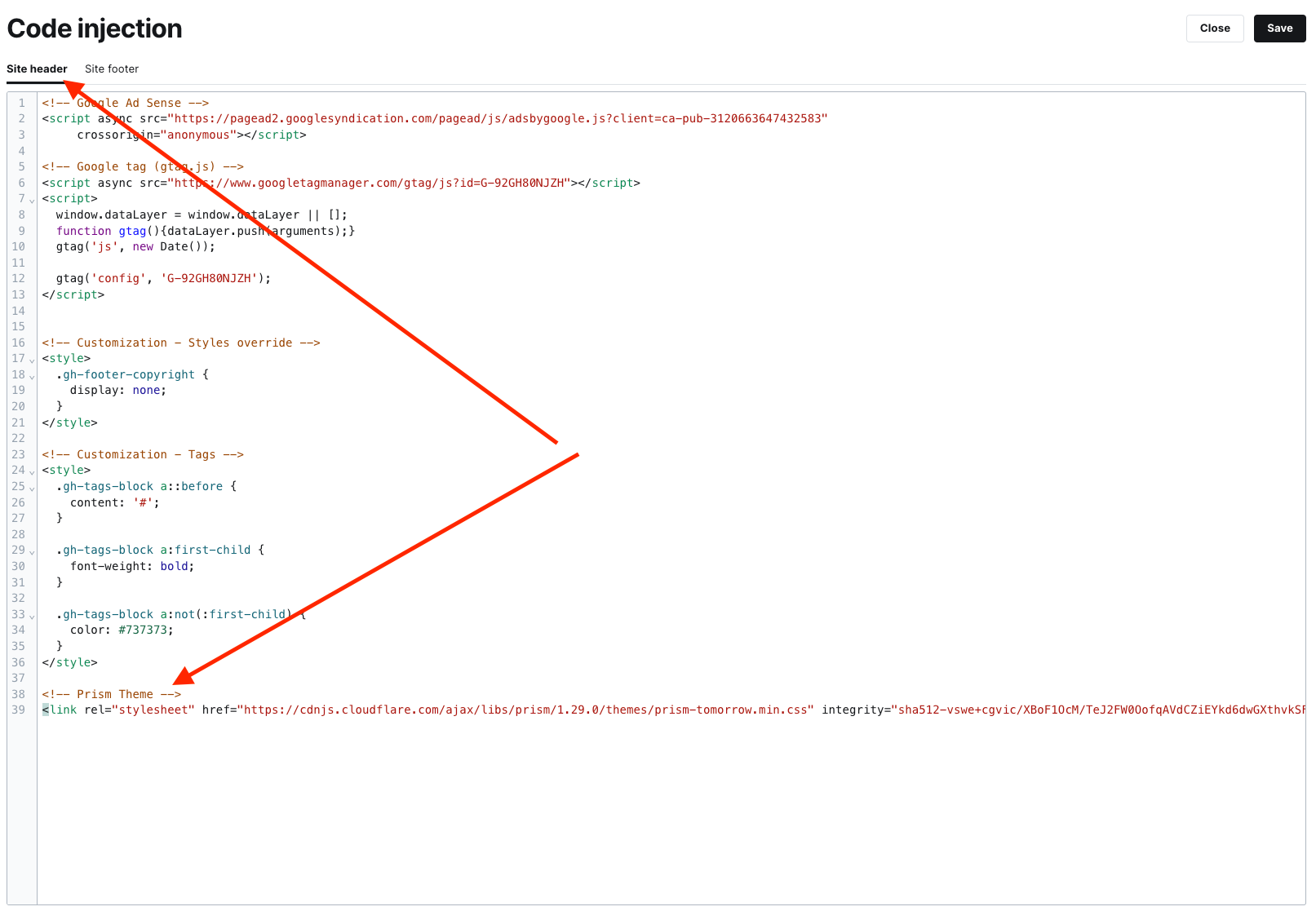 Офіційний сайт Ghost має A complete guide to code snippets, яким я і скористався і вам рекомендую до прочитання, якщо у вас залишились запитання.