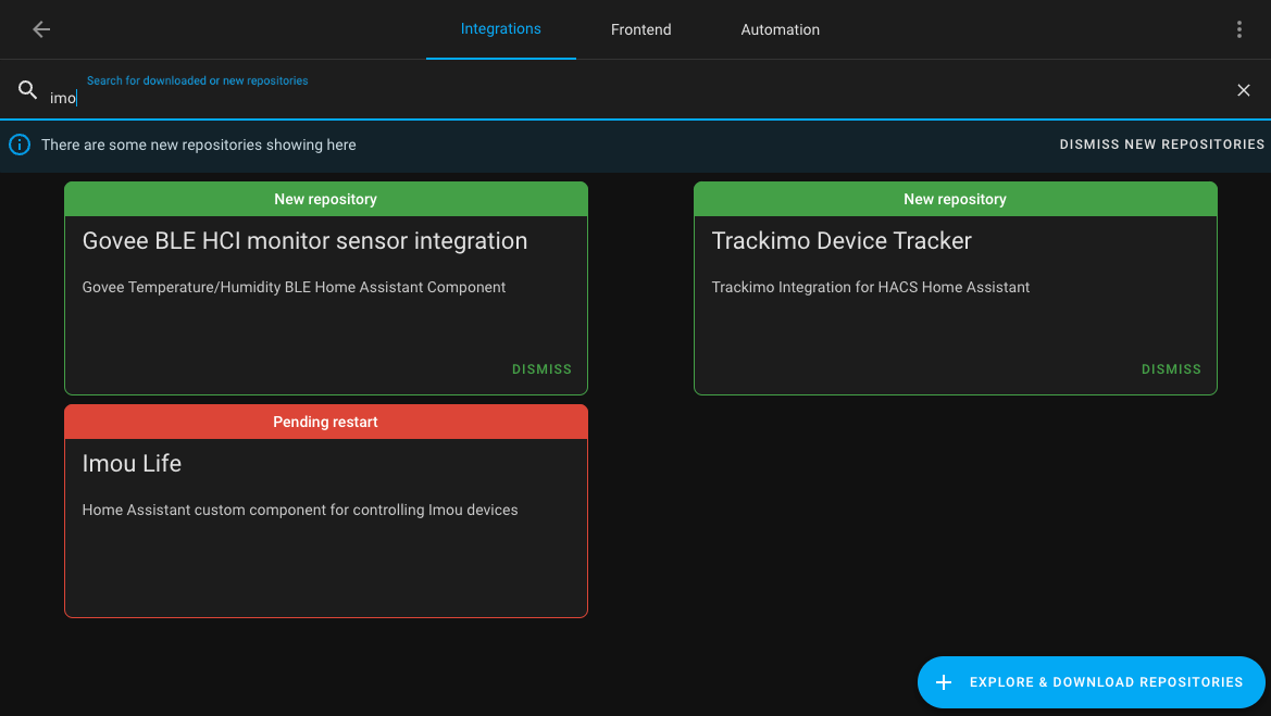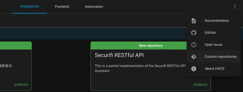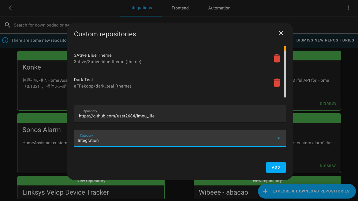 Якщо у вашому HACS у пошуку ви не знаходите серед інтеграцій Imou Life, то вам потрібно додати репозиторій. У HACS у правому куті в контекстному меню обираєте Custom repositories, а у діалозі вводите посилання на репозиторій розробників: https://github.com/user2684/imou_life