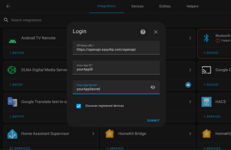 І знову вертаємось до вашого сервера Home Assistant. Перейдіть до Integrations у налаштуваннях та натисніть кнопку Add Registration. Оберіть Imou Life з переліку, та заповніть інформацію ввівши AppId та AppSecret з попереднього кроку.