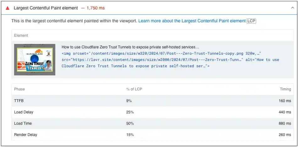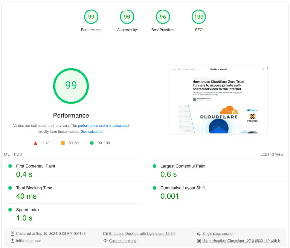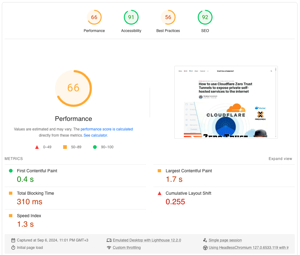 І я одразу ж зробив перший замір. Ось посилання на звіт з результами: https://pagespeed.web.dev/analysis/https-lavr-site-en-how-to-use-cloudflare-zero-trust-tunnels-to-expose-private-self-hosted-services-to-the-internet/482kh81lav?hl=en&form_factor=desktop