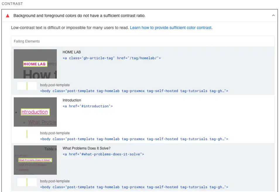 У цьому розділі жалілось на поганий контраст акцентного кольору і порекомендувало виправити це підібравший інший колір за допомогою цього інструменту: https://dequeuniversity.com/rules/axe/4.9/color-contrast