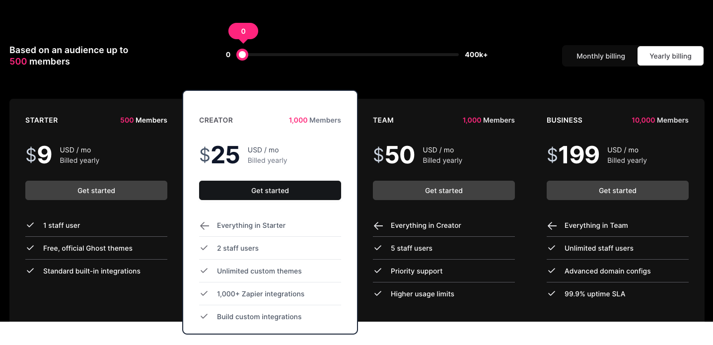 - Ghost(Pro) from the authors of this blog, starting at a minimum subscription of $9 per month.